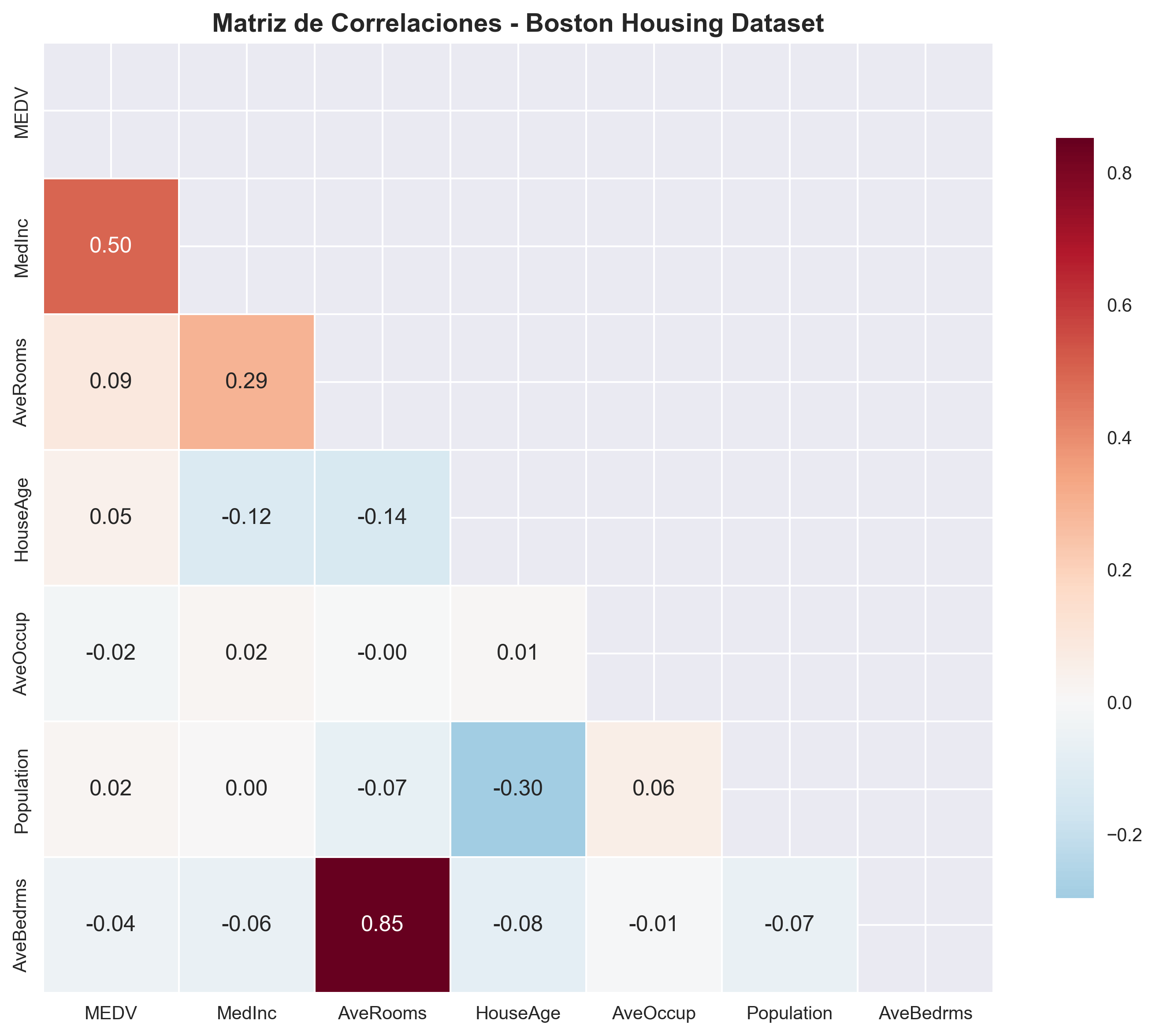 - Variable objetivo: MEDV (precio mediano de viviendas en unidades de $100,000)