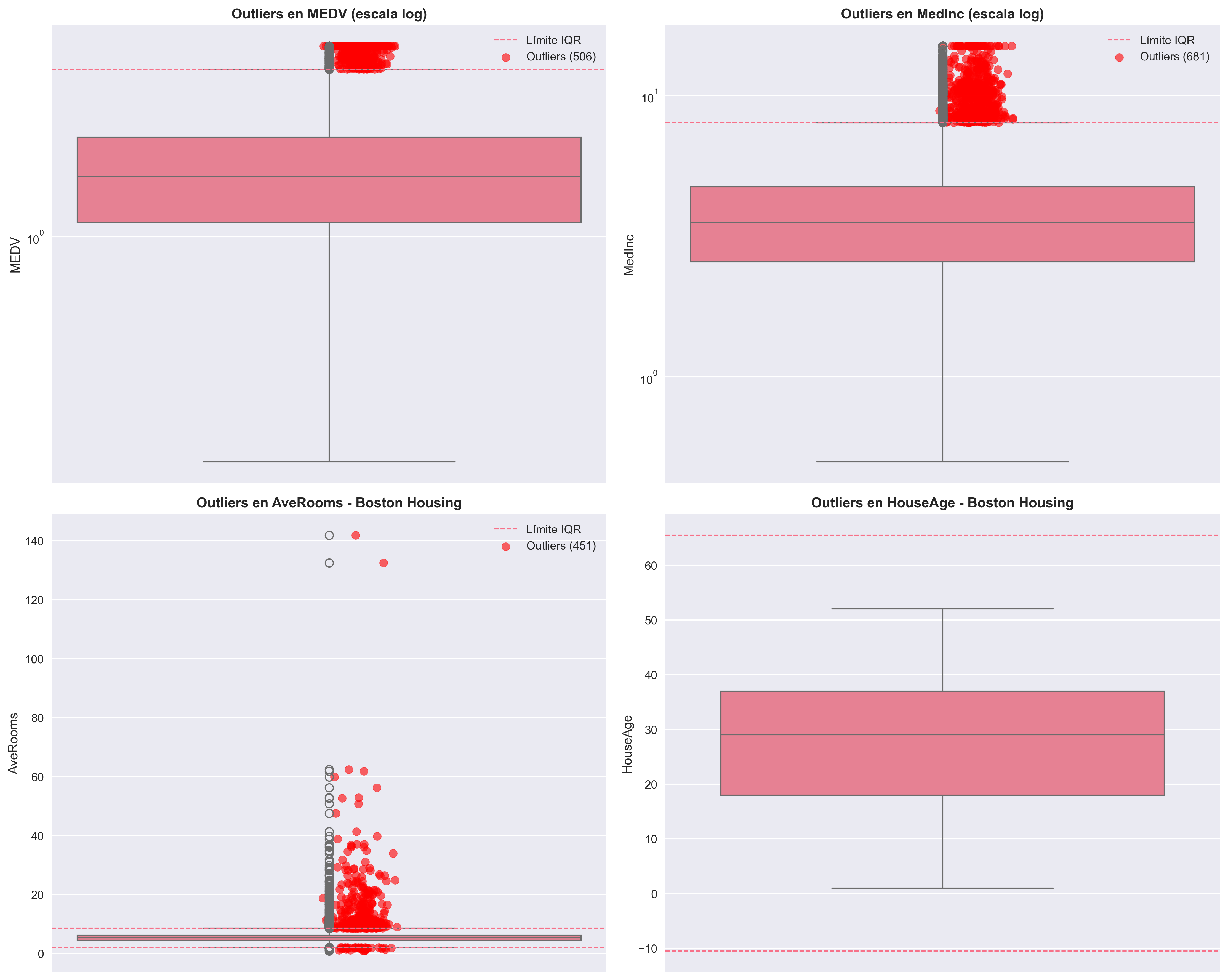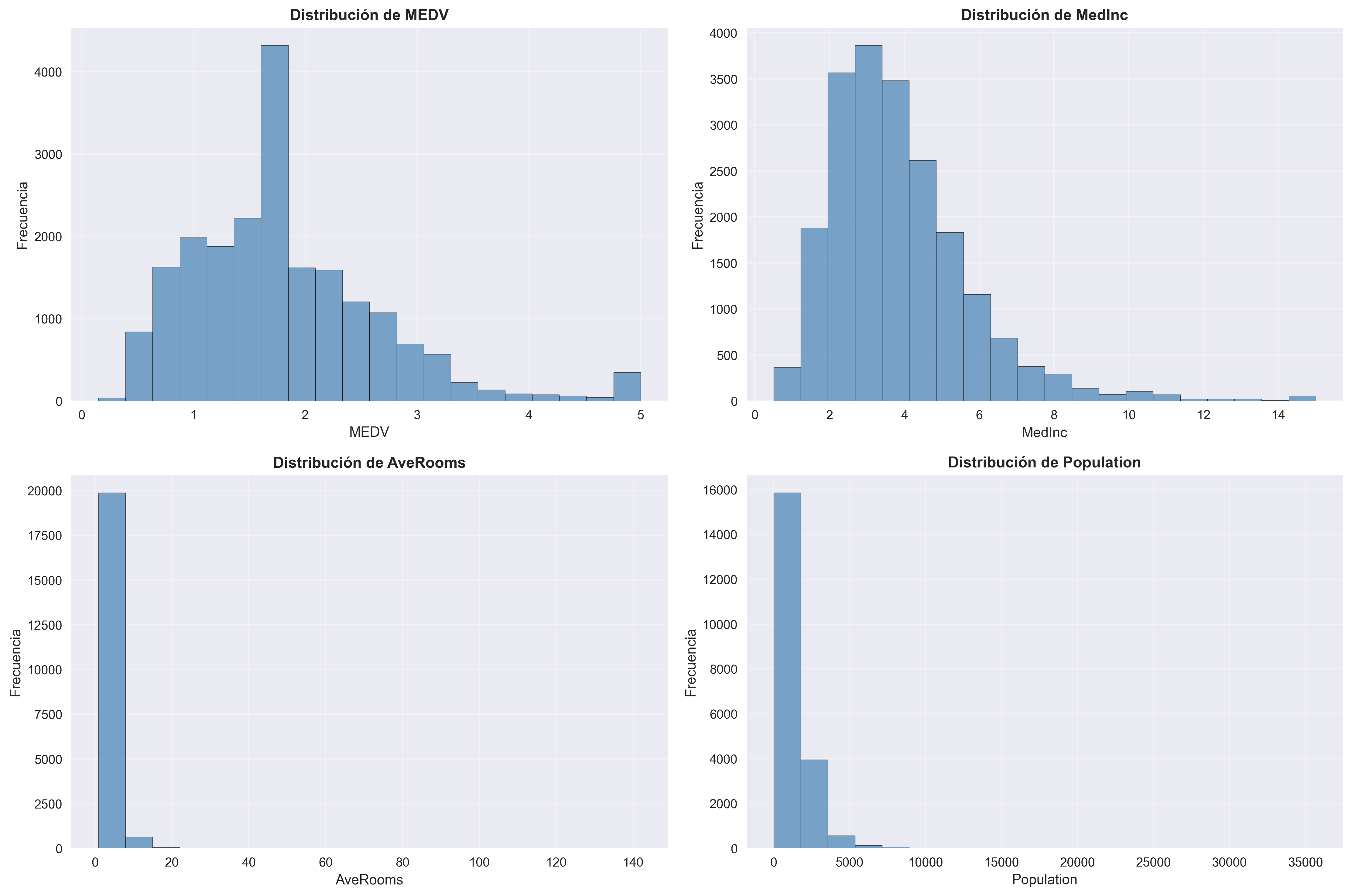 Variables con más outliers: - MedInc: Ingreso mediano (distribución altamente sesgada) - MEDV: Precio de viviendas (valores extremos en ambos extremos) - Population: Población (concentración en ciertas áreas)