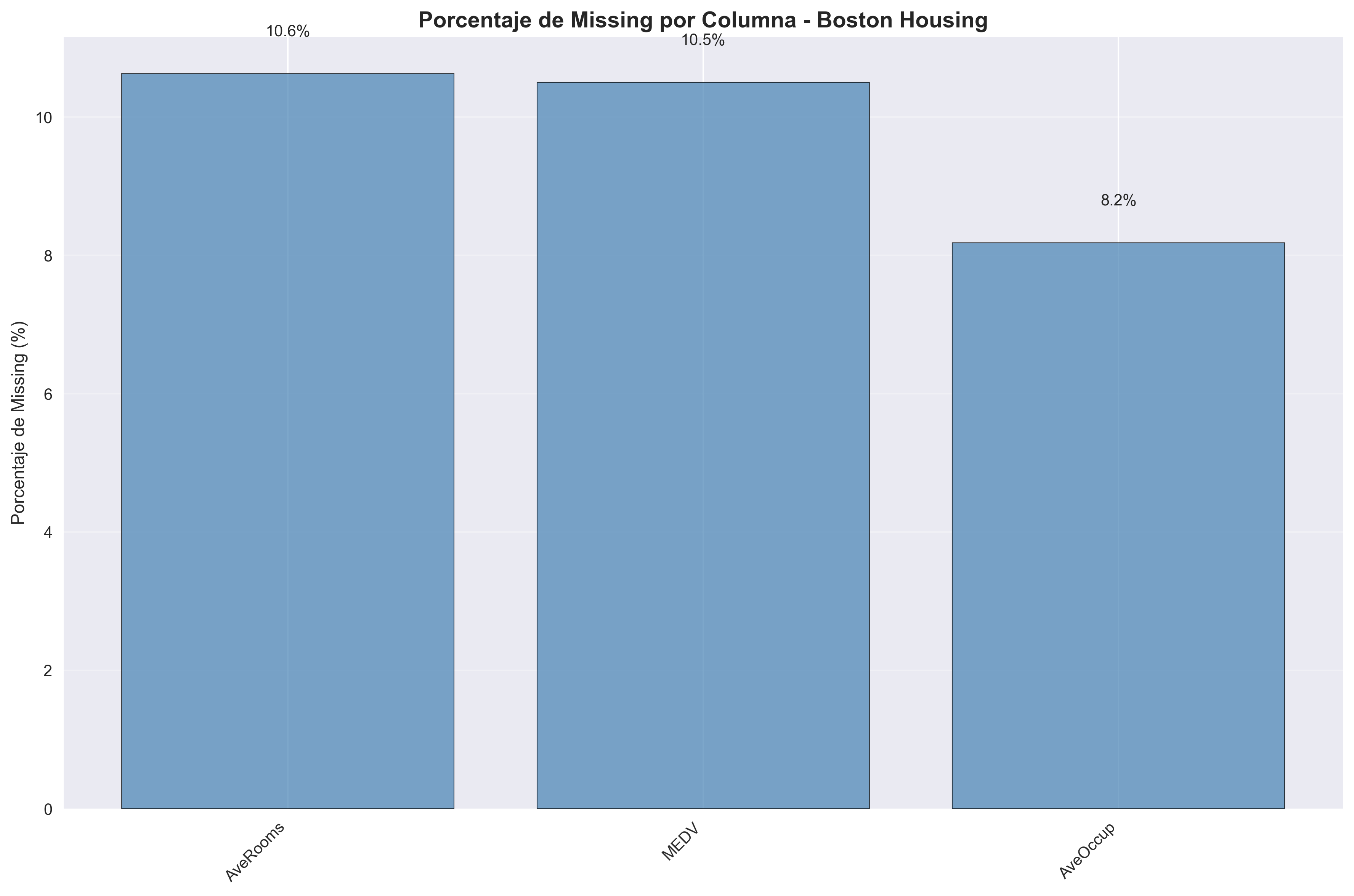 Decisión ética: Se cambió a California Housing Dataset (1990) que proporciona un contexto similar (mercado inmobiliario estadounidense) sin las implicaciones éticas problemáticas, permitiendo un análisis riguroso y responsable de datos faltantes.