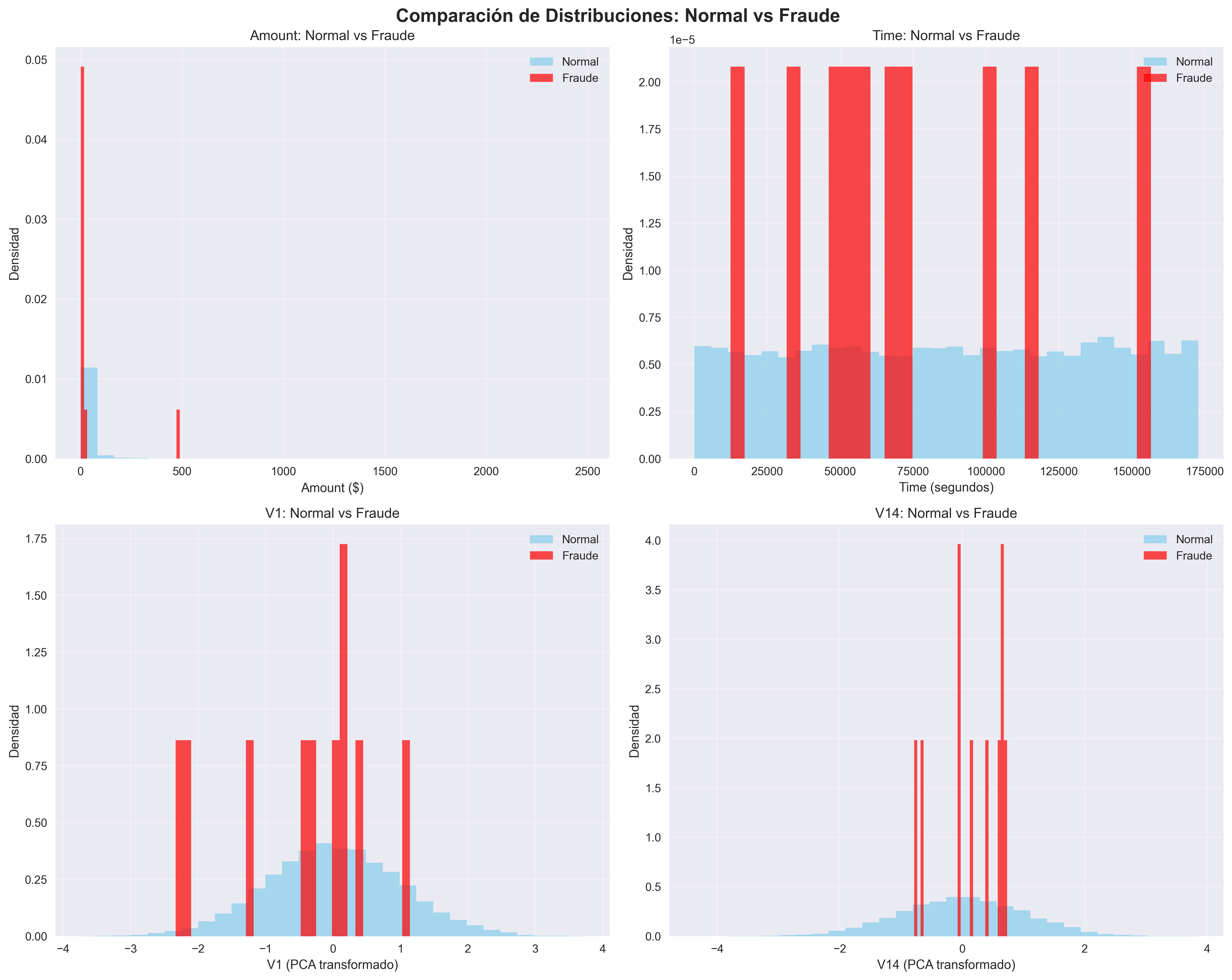 Distribuciones comparativas entre transacciones normales y fraudulentas