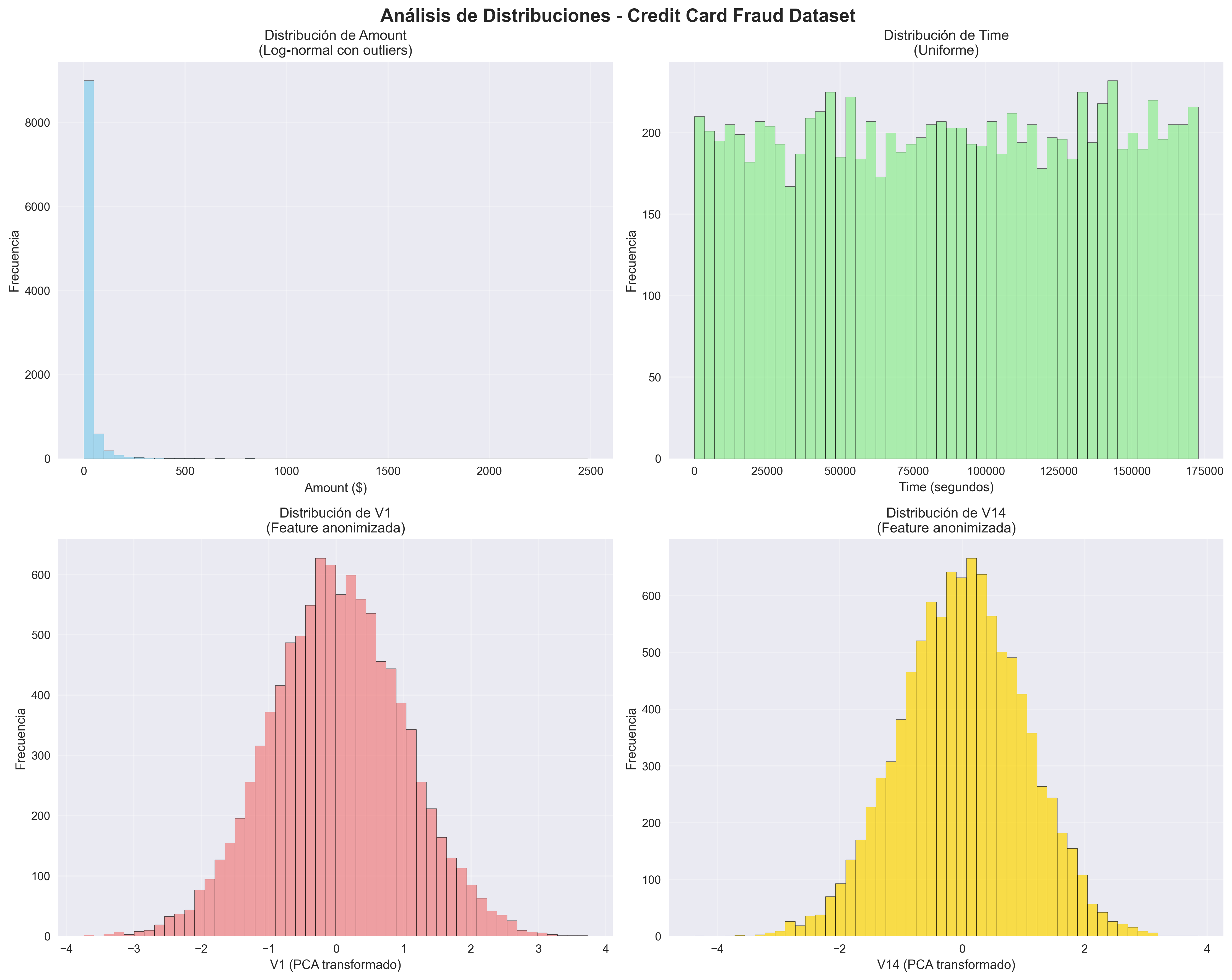 Análisis de distribuciones: Amount (log-normal), Time (uniforme), y features anonimizadas V1, V14