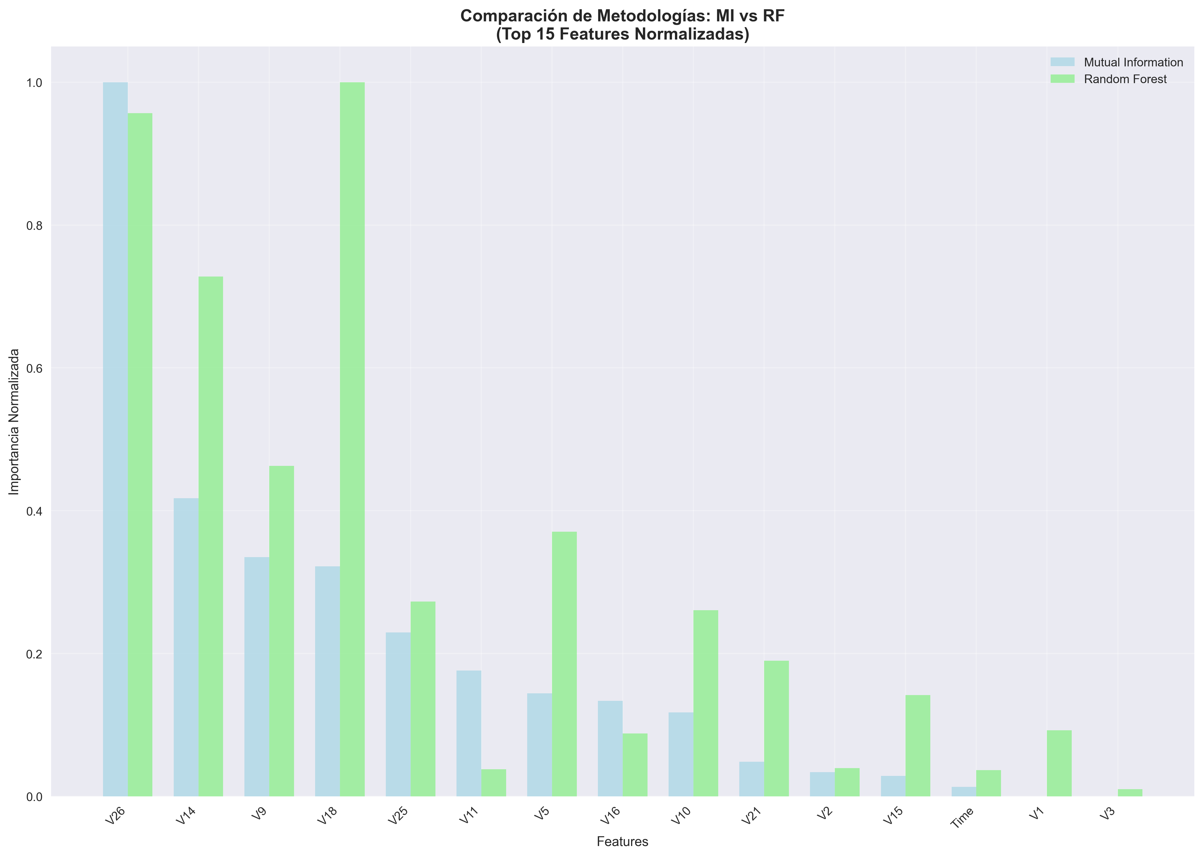 Comparación directa entre Mutual Information y Random Forest (top 15 features normalizadas)
