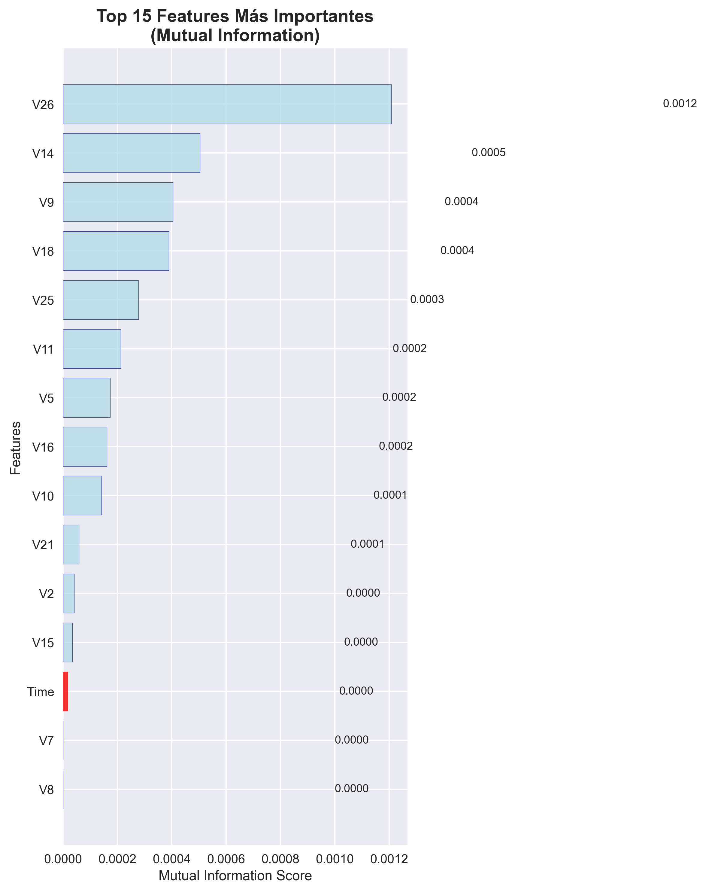 Top 15 features más importantes según Mutual Information (destacando Amount y Time)