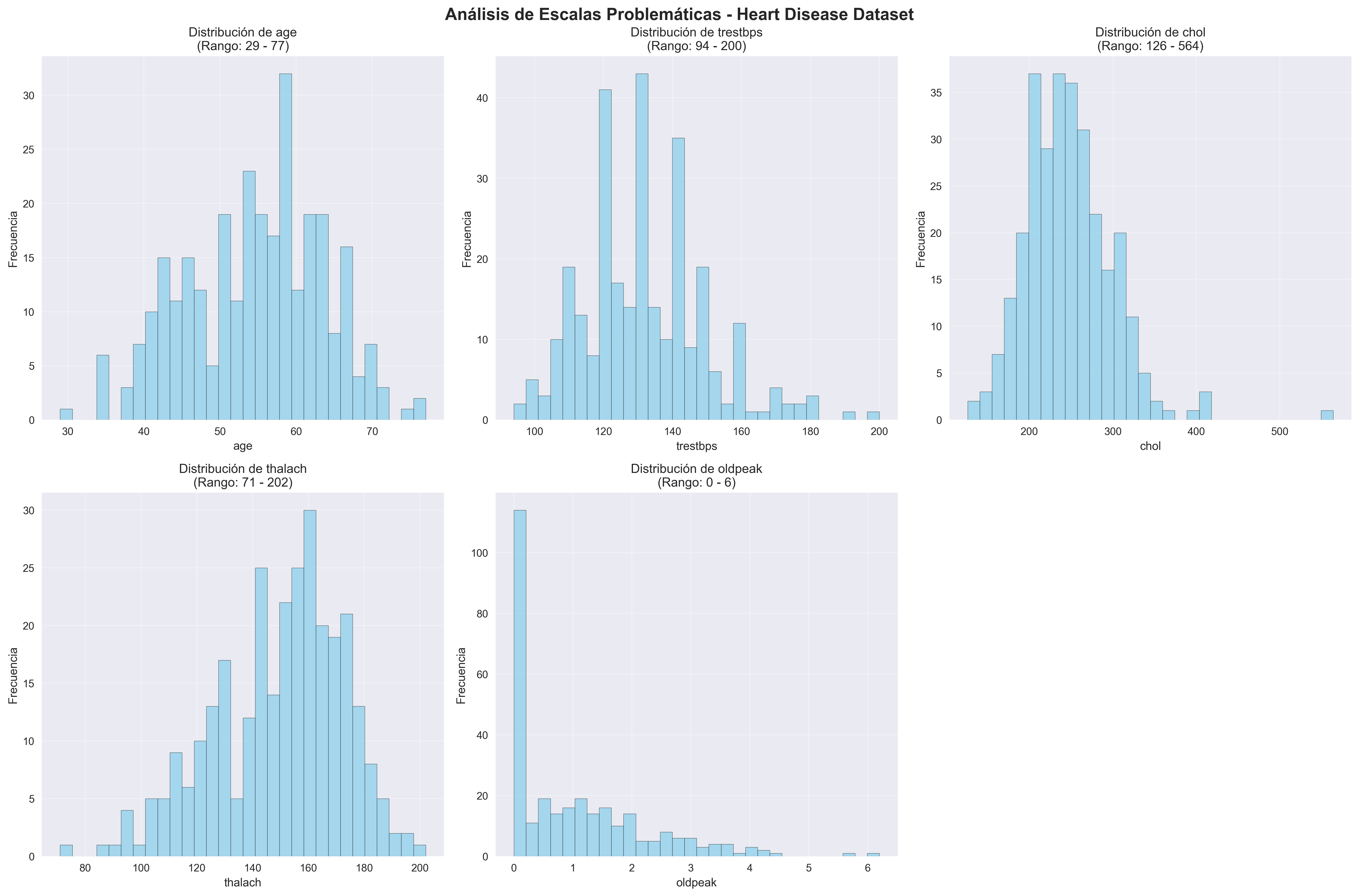 Distribuciones de variables médicas mostrando escalas problemáticas