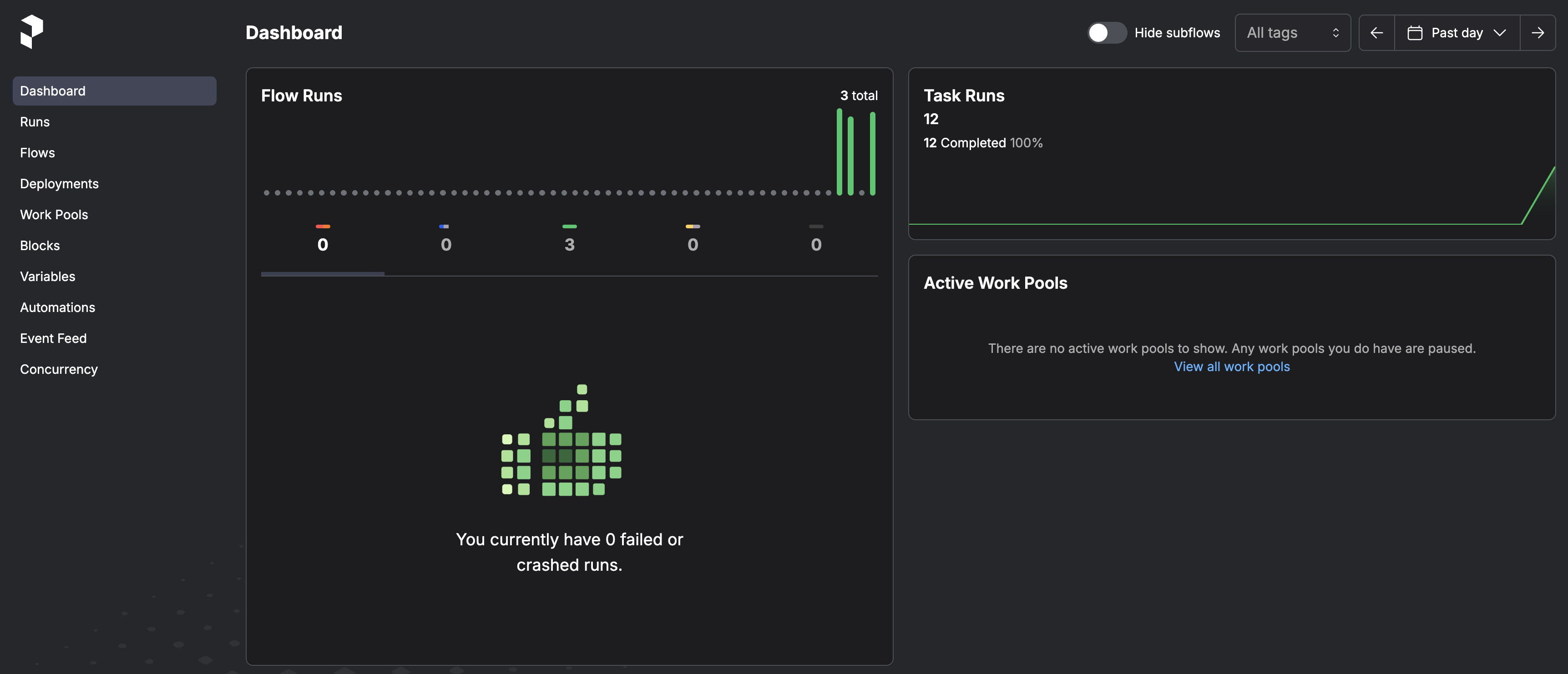 Dashboard de Prefect mostrando los flows ejecutados y tasks completados.