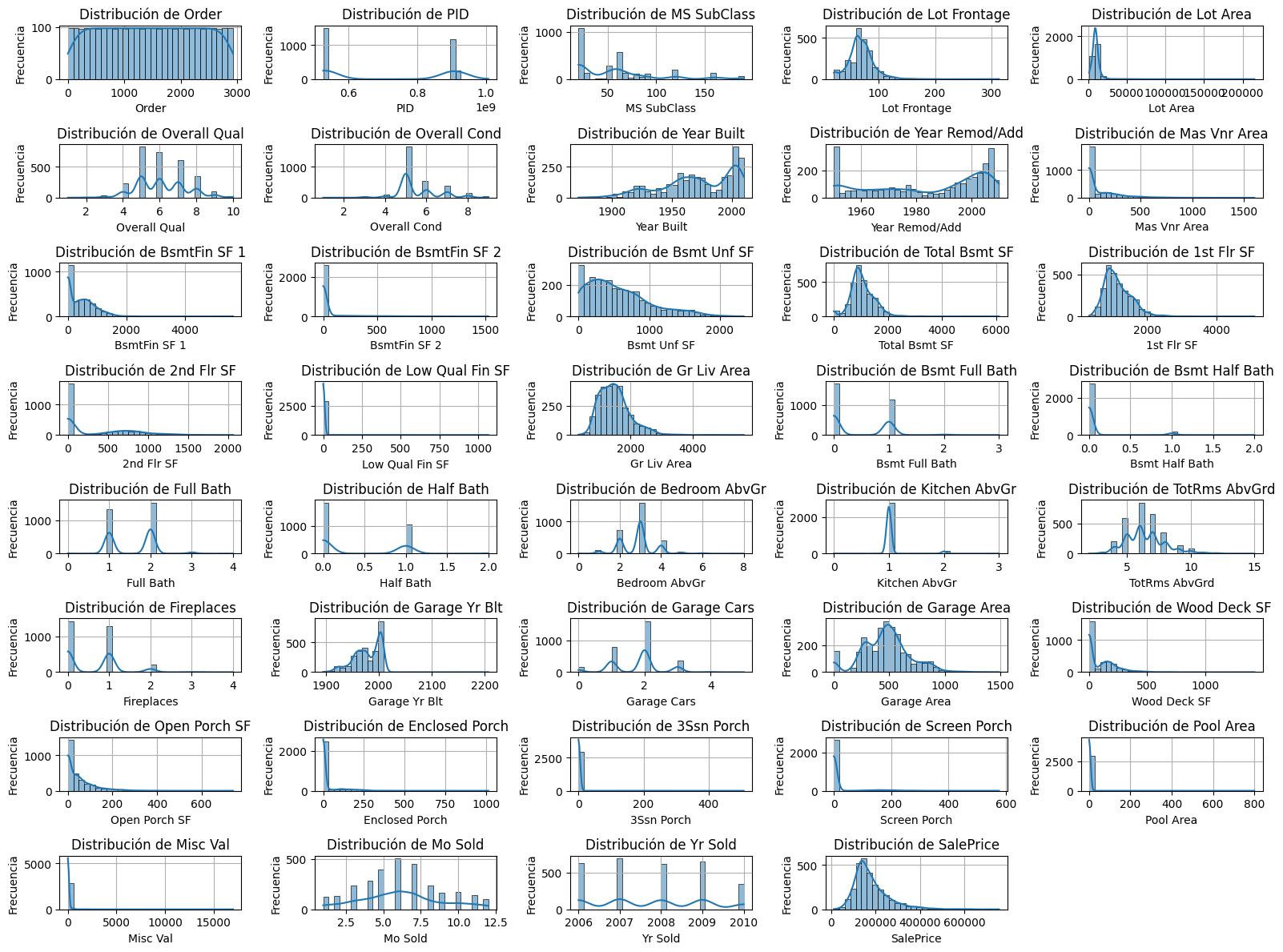 Histogramas de todas las variables numéricas del dataset Ames Housing mostrando la diversidad de formas y escalas presentes en los datos originales.