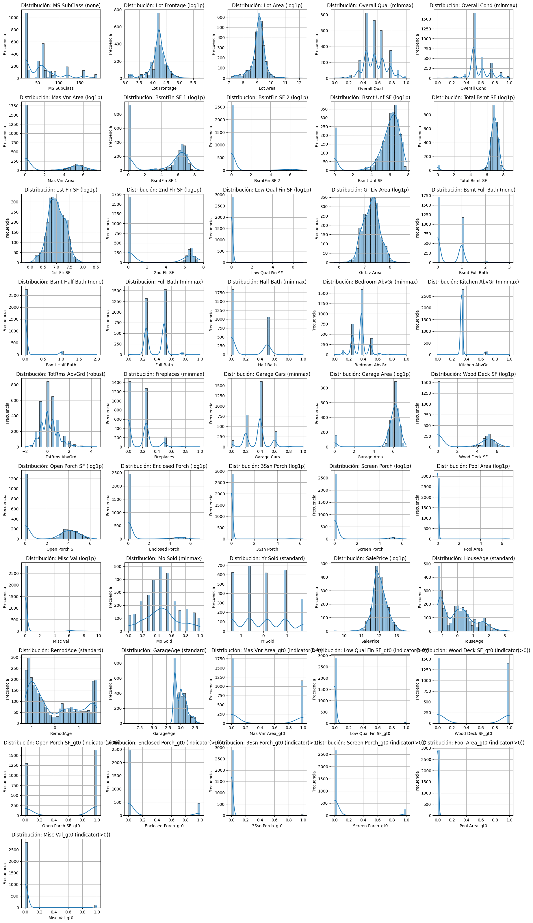 - Resultado en SalePrice: Skew 1.74 → 0.002, Outliers IQR 137 → 59