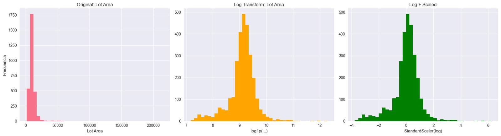 Log transform en Lot Area: reduce skew de 12.8 a -0.5, normalizando la distribución.