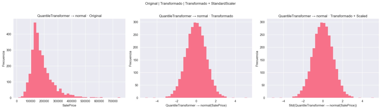 QuantileTransformer: fuerza normalidad perfecta mapeando cuantiles empíricos a distribución normal.